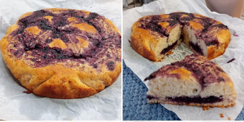 O bolo de iogurte com geleia de mirtilos está prontíssimo para ser degustado. Nos vemos na próxima receita.