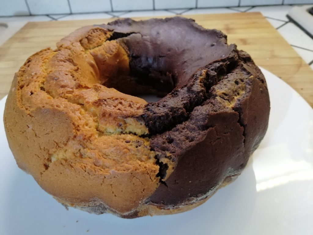 Para me complicar a vida, fiz dois pavimentos invertendo a massa clara sobre a escura e vice-versa, formando um duplo abraço. Vocês, porém, não se compliquem tanto quanto eu 😂