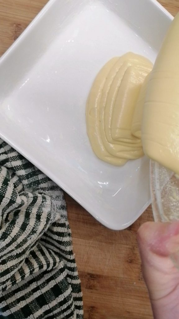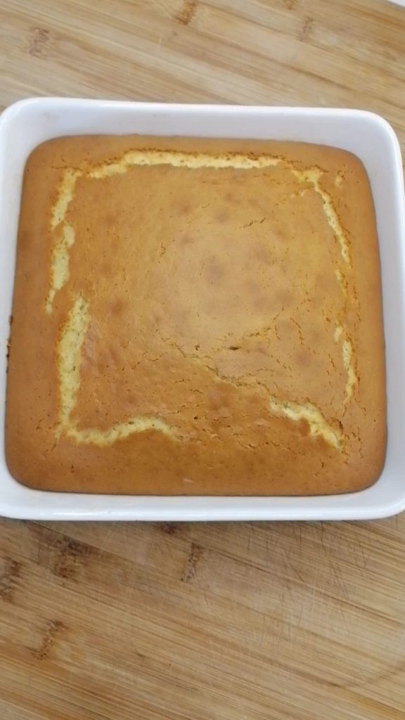 • Uma vez pronto, despeje a mistura na forma 20×20 untada e enfarinhada.