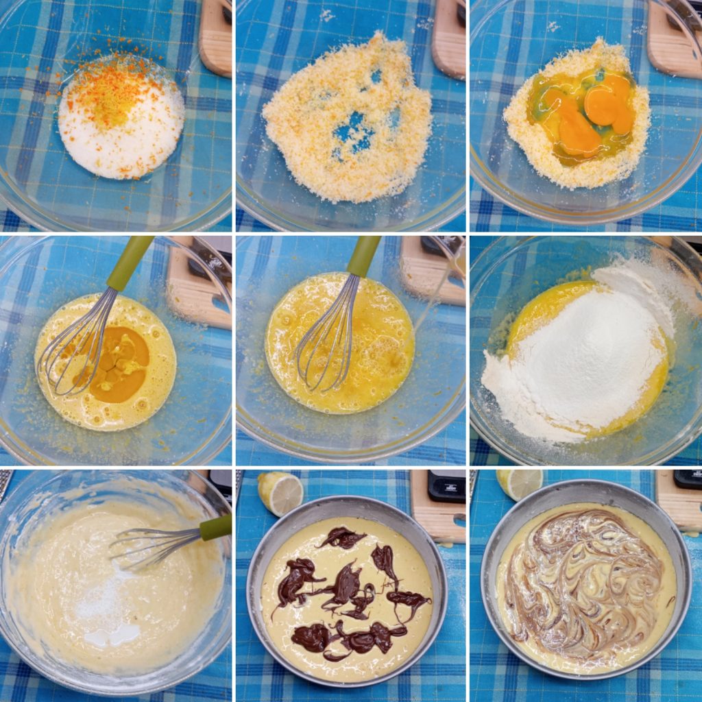 • Em uma tigela, rale as cascas da laranja e do limão diretamente sobre o açúcar granulado. Esfregue bem com os dedos ou com uma colher para perfumar o açúcar, depois adicione os ovos e trabalhe tudo com um batedor manual (ou batedeira elétrica) até que a mistura fique clara e espumosa.