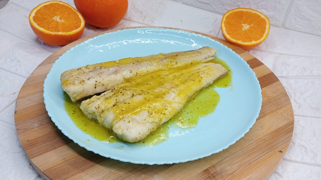 Em uma frigideira, despeje um fio de azeite de oliva extravirgem, deixe aquecer por um minuto e depois coloque os filés, deixando dourar por um minuto de cada lado. Após esse tempo, despeje o suco de laranja previamente preparado e coado. Cubra com a tampa e deixe cozinhar por cerca de 10 minutos em fogo baixo. Se secar muito, adicione um pouquinho de água e lembre-se de salgar e temperar a gosto.