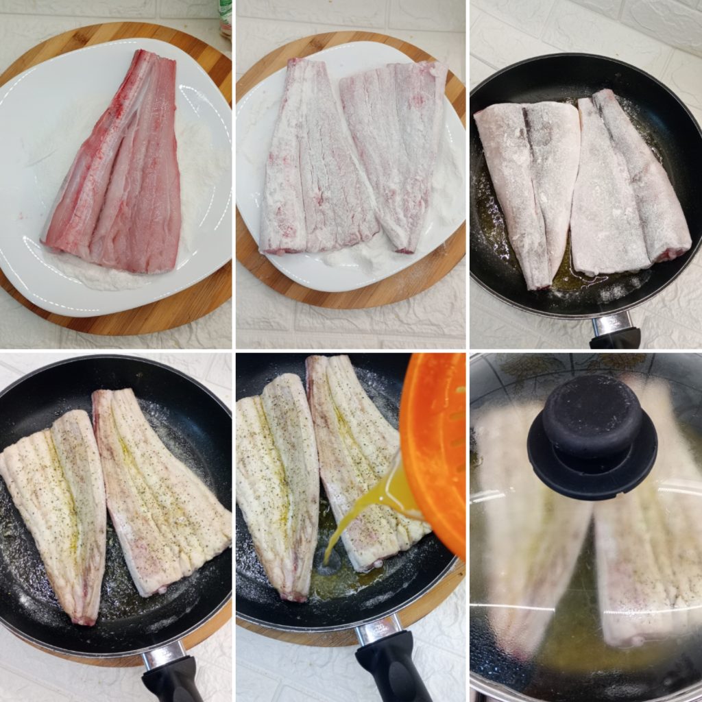 Primeiro, proceda para empanar os filés de cação: eu usei farinha de arroz, mas você pode usar a que preferir.