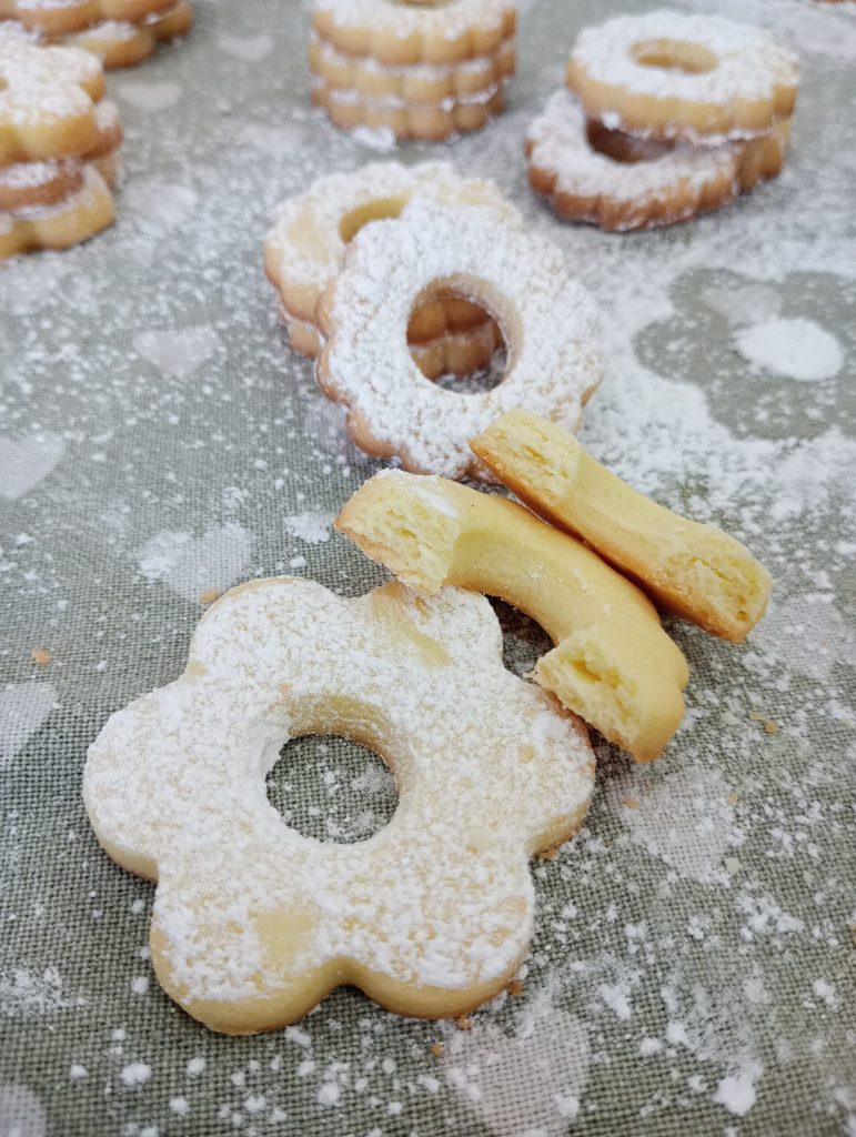 Pequenos biscoitos deliciosos em forma de flor e com um buraco no meio, meus biscoitos preferidos desde quando eu era pequena.