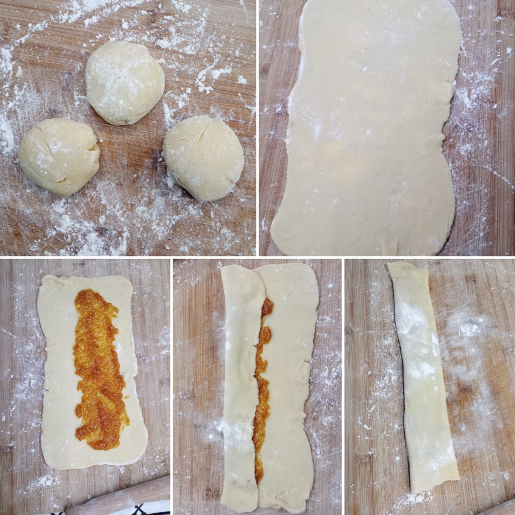 Divida o bloco em três partes. Comece a esticar o bloco em uma superfície enfarinhada ou entre duas folhas de papel manteiga, tentando criar um retângulo fino de 25 cm de comprimento e 15 cm de altura. Coloque a geleia no centro e crie o rolinho dobrando o lado mais longo para dentro.