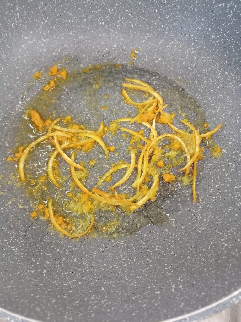 Enquanto isso, certifique-se de que a massa esteja cozida. Escorra al dente (bem al dente) e despeje diretamente na panela com os cítricos e o óleo, então salteie rapidamente por cerca de um minuto, para que absorva os primeiros aromas.