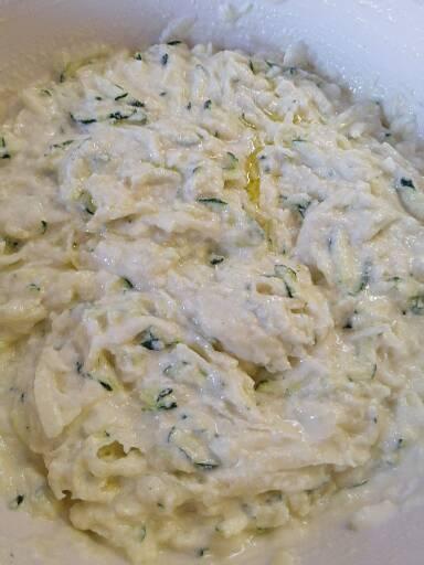 Pegue uma tigela grande. Despeje as batatas raladas e a abobrinha ralada (se os vegetais estiverem muito aguados, esprema-os bem).