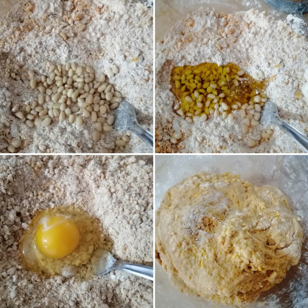 Neste ponto, adicione os pinhões, o azeite e o ovo inteiro.
