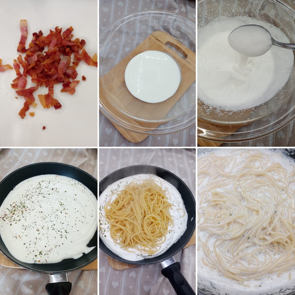 Enquanto o macarrão cozinha, despeje o creme em uma tigela e bata levemente (deve ficar cremoso, não muito firme, esse é o segredo do creme final).