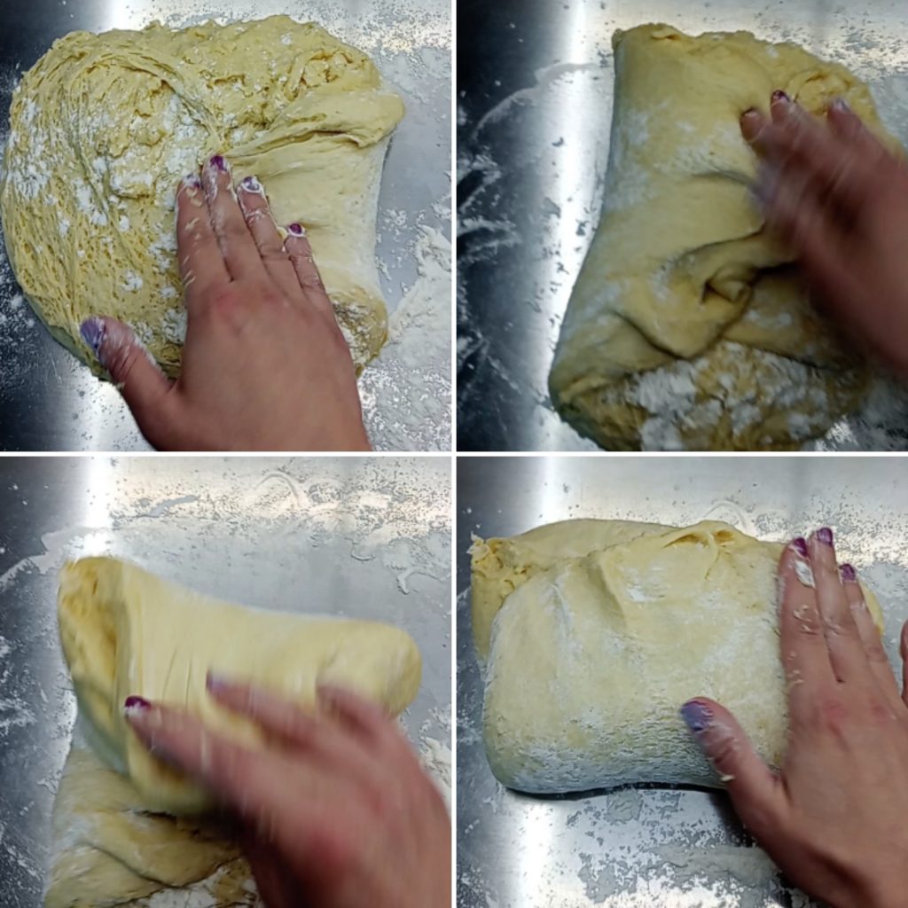 Incorpore a manteiga amolecida em pedaços, aos poucos, continuando a amassar com energia até que você obtenha uma massa lisa, elástica e que não grude mais nas mãos ou que se desgrude da batedeira.
