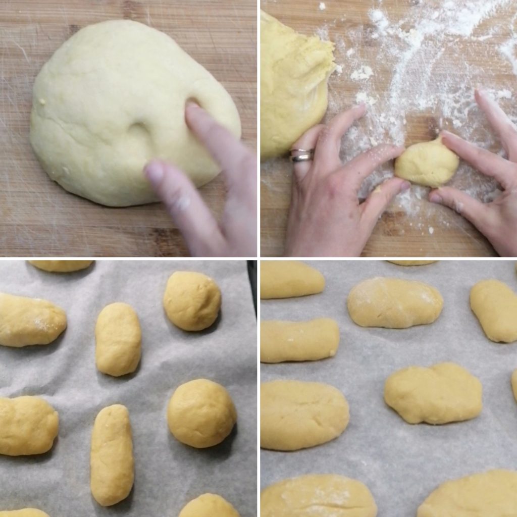 Transfira a massa para uma superfície enfarinhada, trabalhe até formar um bloco. Comece a formar bolinhas ou outras formas e coloque-as em uma assadeira forrada com papel manteiga.