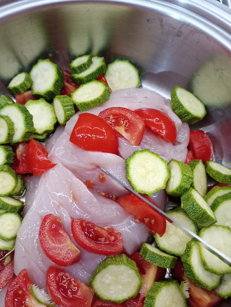 Para um resultado saboroso, escolhi acompanhar o frango com tomatinhos e abobrinhas, mas sinta-se à vontade para usar os vegetais que preferir… o cozimento em fogo baixo com tampa fará o resto.