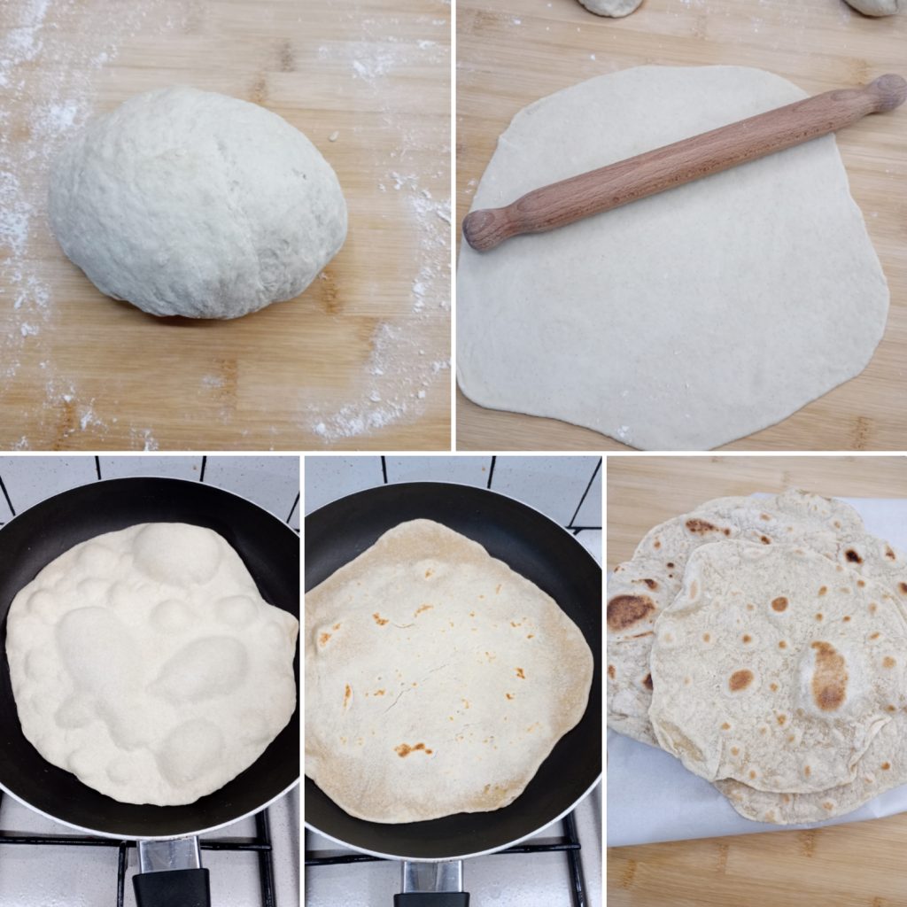 Em uma tigela, despeje a água e o óleo, misture com um garfo e adicione gradualmente a farinha e o sal, continue a trabalhar a massa em uma superfície lisa por alguns minutos. Divida a massa em 7/8 bolinhas.