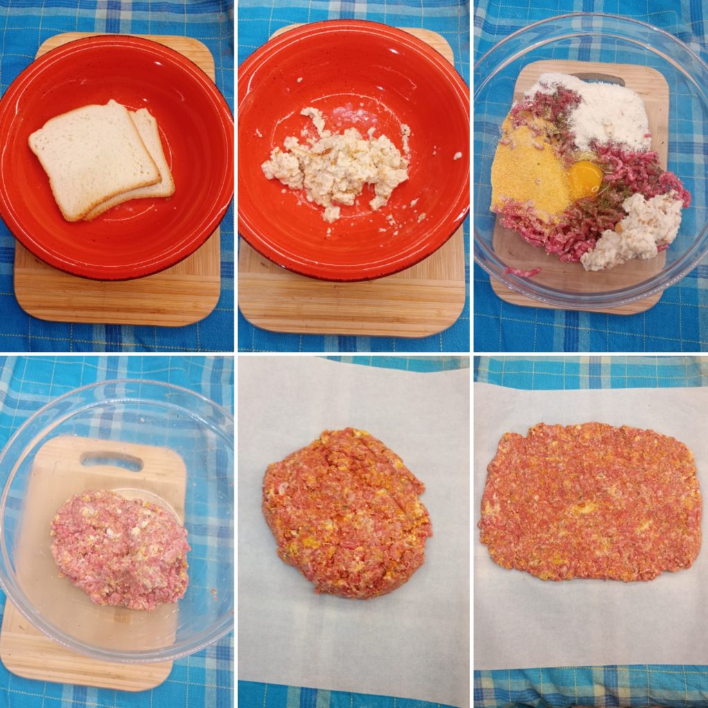 Para começar, molhe as fatias de pão com um pouco de leite até que fiquem bem macias. Em uma tigela grande, misture todos os ingredientes: a carne moída, o ovo, o queijo, o pão bem espremido, o sal e a salsa picada; misture bem até obter uma massa homogênea. Uma vez pronto, espalhe sobre uma folha de papel manteiga, nivelando bem para dar uma forma retangular uniforme.