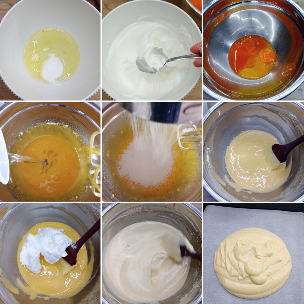 Em uma tigela separada, bata as gemas até ficarem claras e espumosas. Em seguida, adicione o óleo de sementes e a água, despejando lentamente. Por fim, incorpore a farinha peneirada.