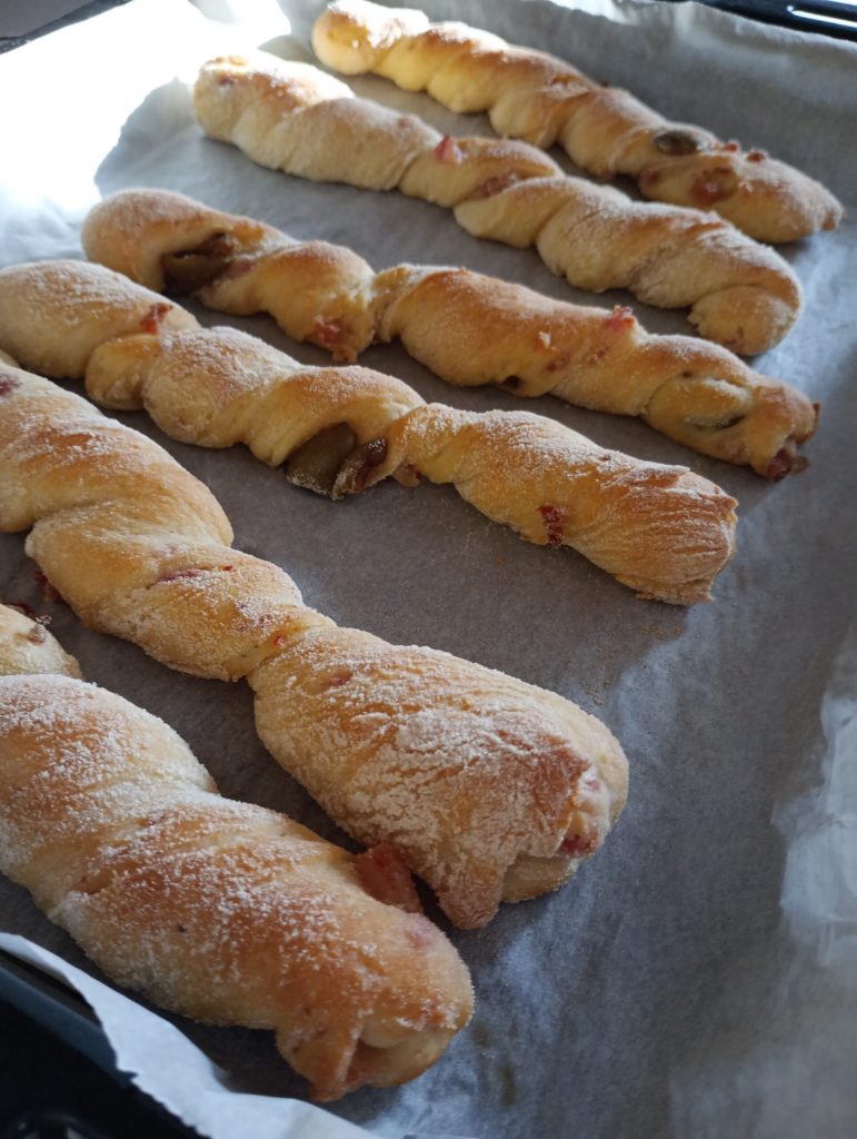 Disponha os filõezinhos ou torcidinhos em uma assadeira forrada com papel manteiga, cubra com filme plástico e deixe fermentar por mais uma hora. Asse a 200° no forno convencional pré-aquecido por 15 minutos; nos últimos 2 minutos, ligue o grill para obter uma douração perfeita.