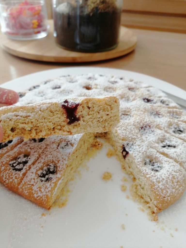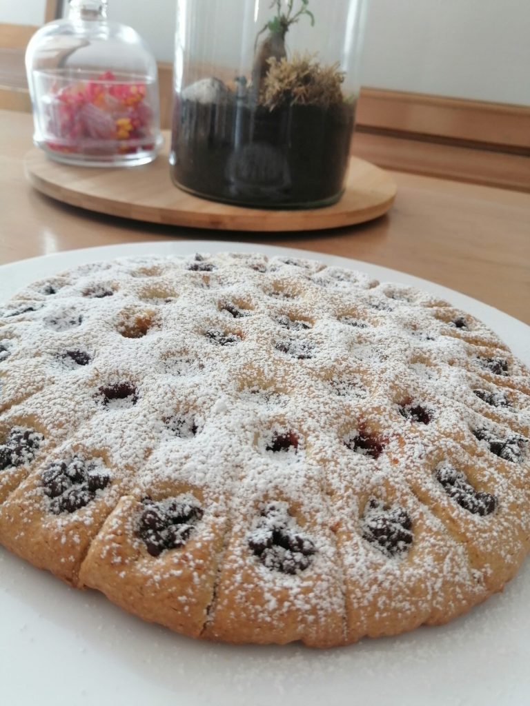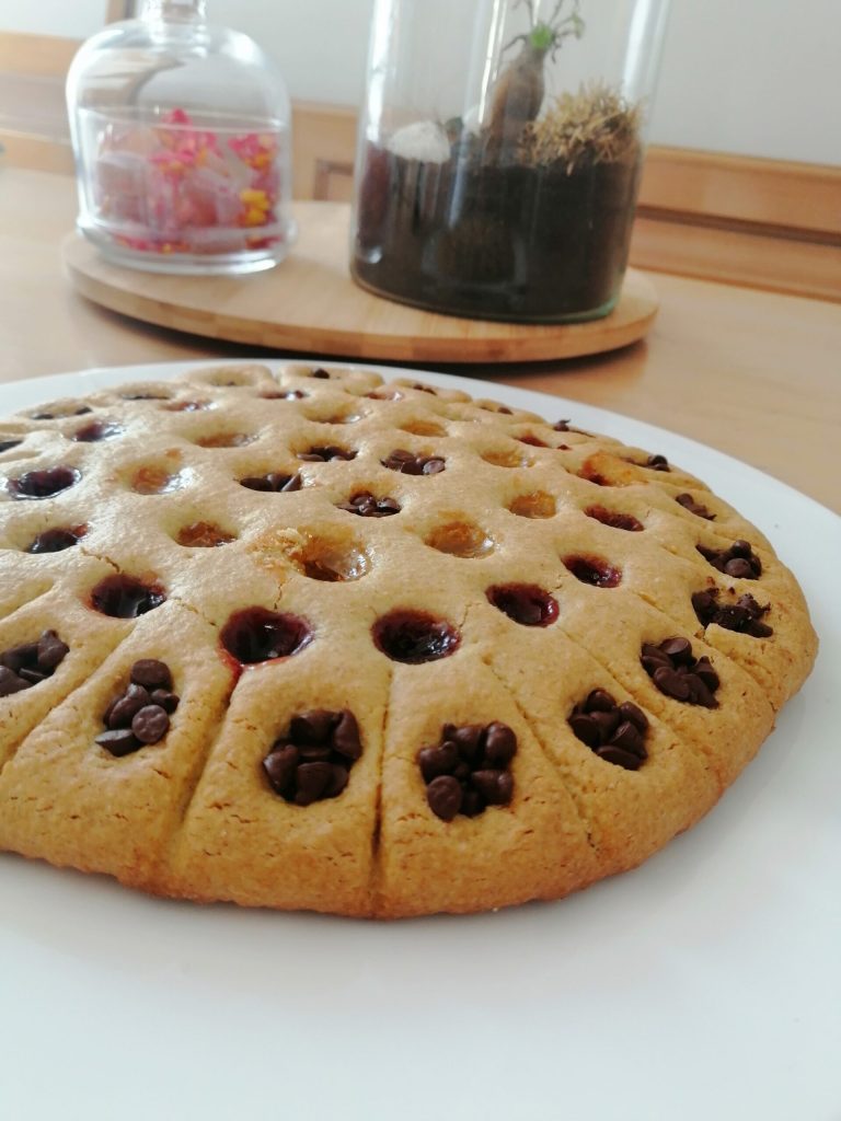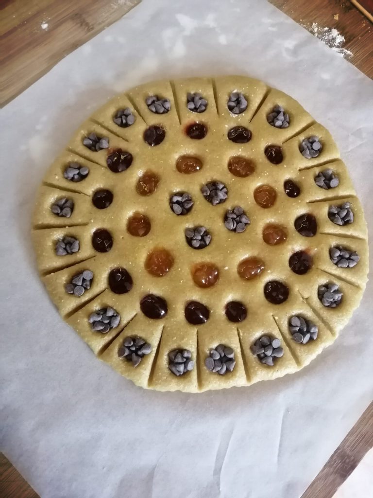 Uma torta diferente das habituais. Feita com massa quebrada de óleo, portanto, é muito mais leve do que a massa com manteiga. Uma casca crocante com interior macio, fiz pequenos furos onde coloquei as geleias. Uma torta deliciosa com uma aparência muito divertida. Usei metade de farinha de aveia, que pode ser substituída tranquilamente pela farinha 00.