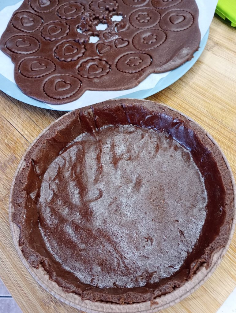Coloque a massa estendida dentro de uma forma revestida com papel manteiga ou untada e enfarinhada. Coloque o creme já frio dentro e nivele, eu decidi fazer algumas formas como cobertura, se preferir, faça as clássicas tiras com a massa restante e faça biscoitos. Asse a torta a 180 graus em forno pré-aquecido por 30 minutos.