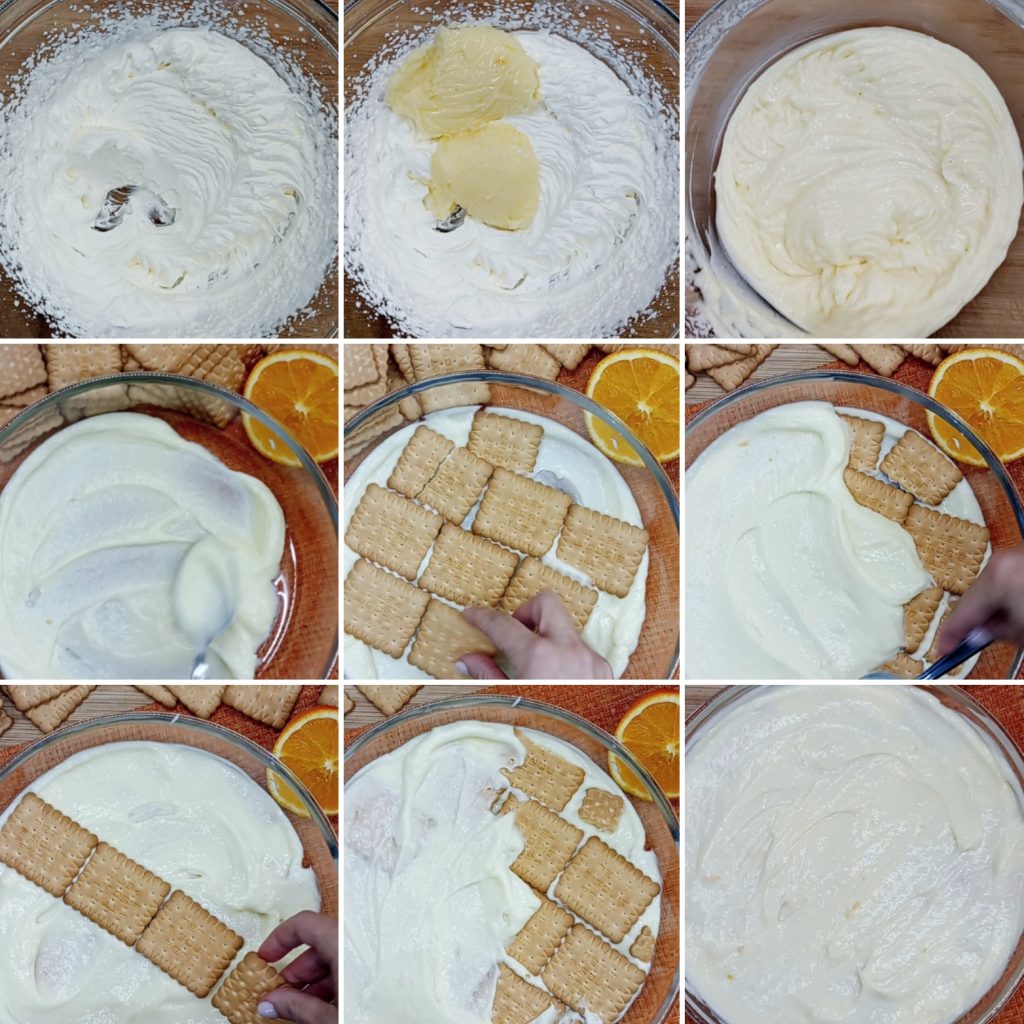 Coloque no fundo da travessa o creme e depois os biscoitos, continue assim até o fim dos ingredientes. Eu fiz três camadas.