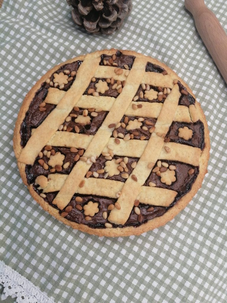 Estenda a massa bem fina diretamente sobre papel manteiga. Se necessário, enfarinhe. Coloque a massa em uma forma de silicone ou em uma forma untada e enfarinhada, aparando as bordas com uma faca. Recheie com o creme de avelã ou geléia. Com a massa restante, faça tiras e coloque-as sobre a superfície.