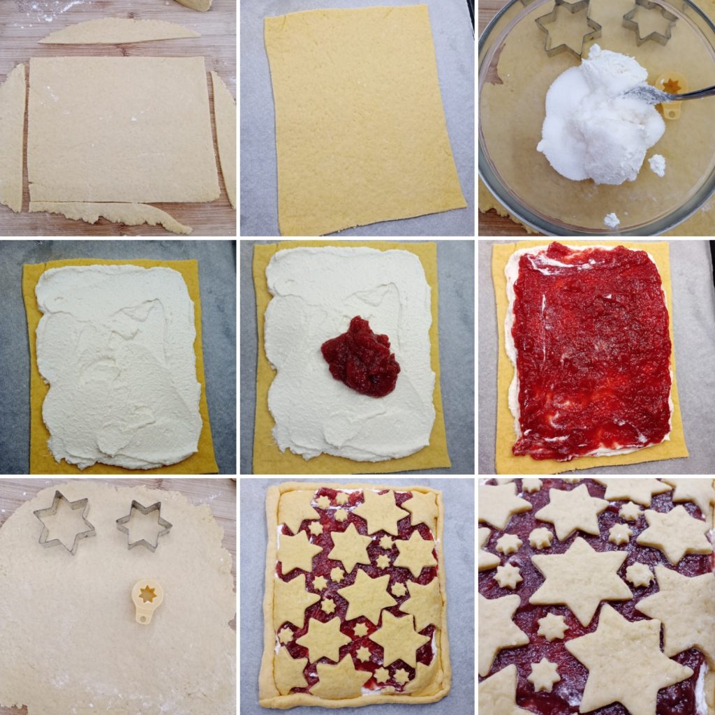 Estenda a outra parte da massa e faça as formas que preferir, eu escolhi estrelas. Cubra a superfície a seu gosto, ao longo das bordas coloquei cordões de massa para evitar que o recheio escorra durante o cozimento.