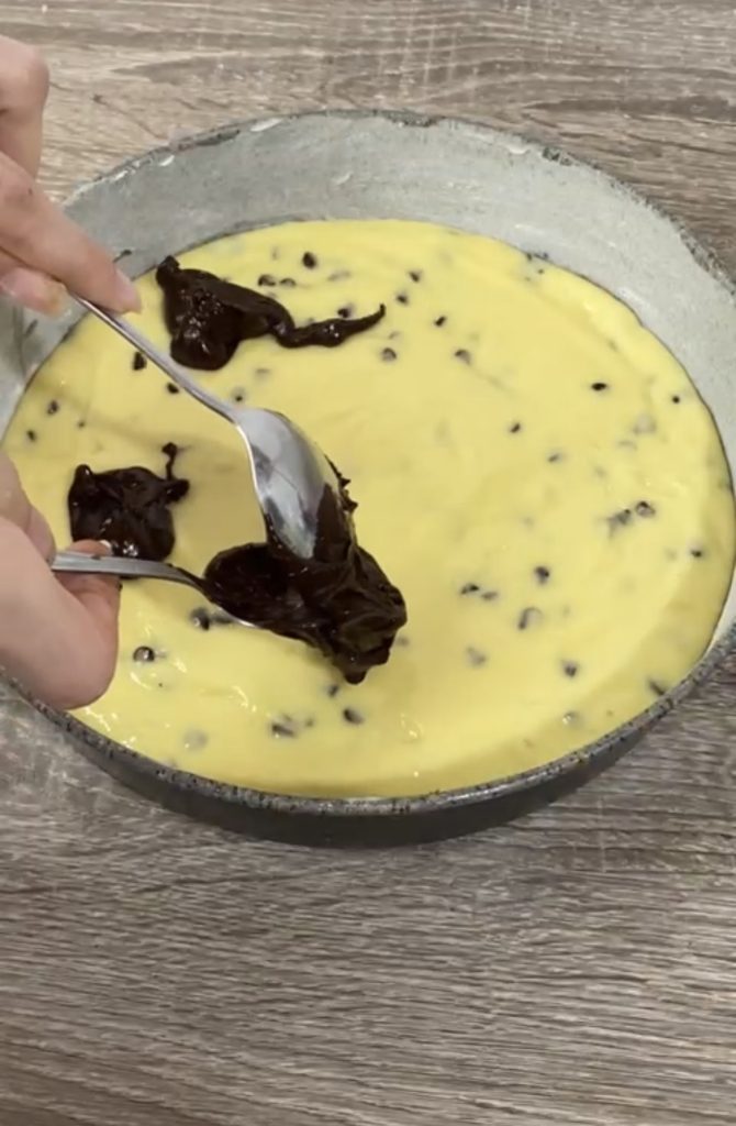• Com a ajuda de duas colheres, coloque a mistura de cacau na forma, distribuindo-a em colheradas.
