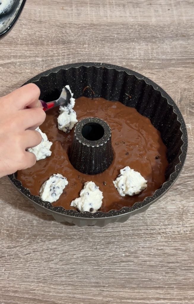 Na superfície do bolo, adicione pequenas porções de ricota usando duas colheres de chá.
