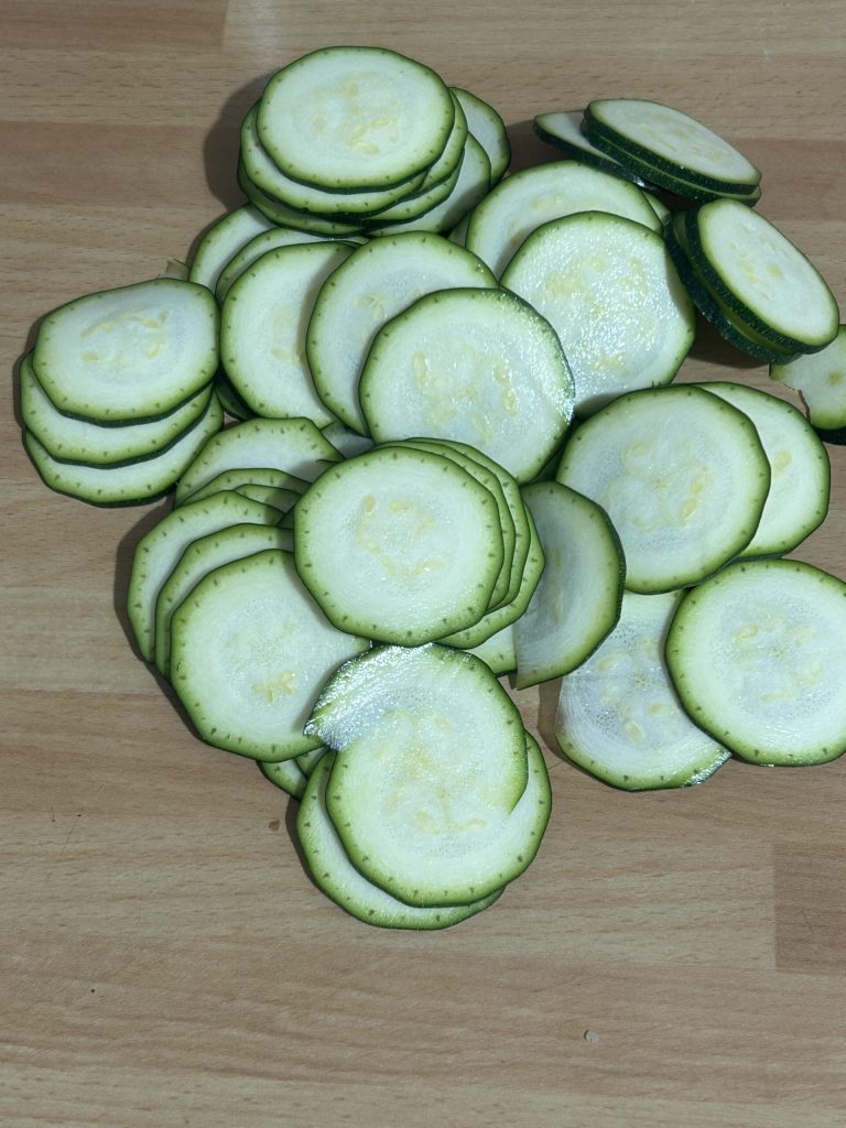 Corte as abobrinhas em rodelas usando uma mandolina, para que fiquem todas com a mesma espessura.