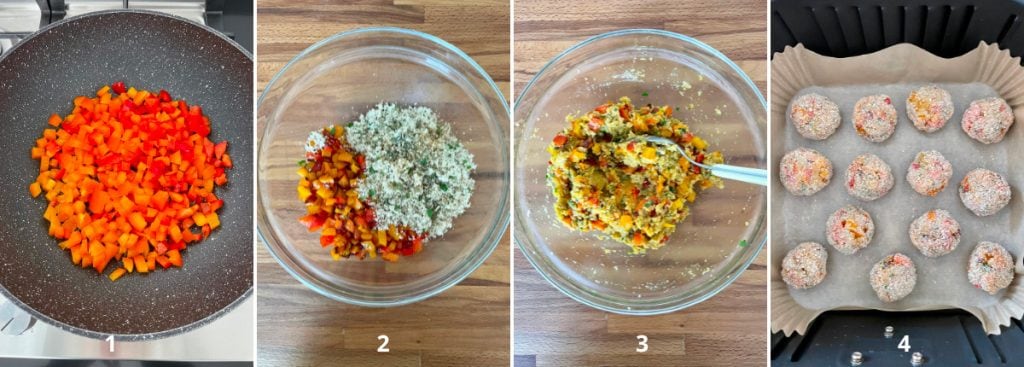 Deliciosas almôndegas de pimentão, muito fáceis de preparar, com cozimento na fritadeira a ar… são feitas com pimentões refogados, ovos e pão, são ótimas como segundo prato vegetariano, mas também como aperitivo se servidas em pequenas tigelas, junto com outros fritos ou vegetais. Se você não tem a fritadeira, pode cozinhá-las no forno (nas notas no final escrevi as instruções) ou na panela. Experimente esta receita, é realmente fácil, rápida e saborosa!
