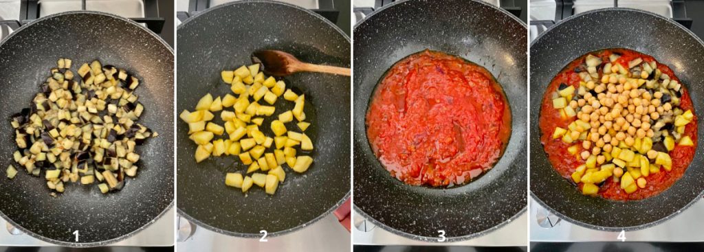 Agora adicione a berinjela, as batatas e o grão-de-bico (4). Misture e continue por mais 5-10 minutos, sempre em fogo médio-baixo.