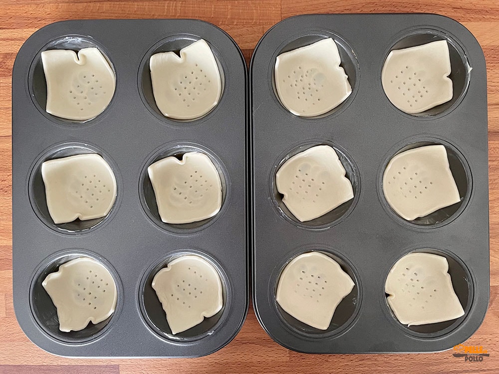 • Unte uma forma de muffin com um pouco de manteiga, disponha nos moldes individuais a massa folhada e fure um pouco no centro para que não infle demais.