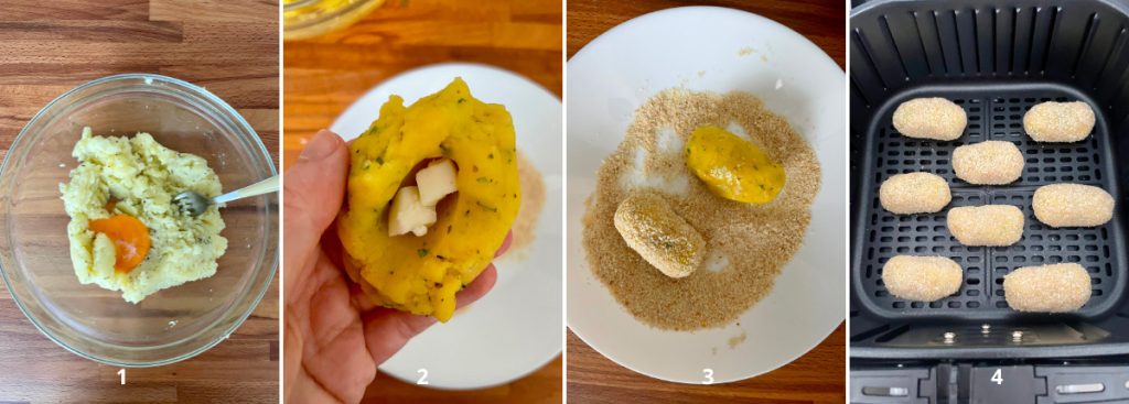 Os croquetes de batata na fritadeira a ar estão prontos, sirva-os imediatamente, para que fiquem crocantes por fora e cremosos por dentro… bom apetite!