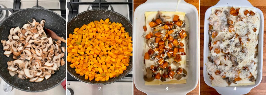 Lasanha com abóbora e cogumelos, um prato principal rico e saboroso, perfeito para o domingo e para as festas… muito simples de fazer, esta lasanha de forno é cremosa e saborosa, ótima se você tem convidados vegetarianos. Para acelerar, usei as folhas secas já prontas, mas você pode fazer a massa, ou usar folhas verdes ou de farinha integral. O molho é muito fácil e rápido, basta cozinhar na frigideira os cogumelos e a abóbora cortada em cubos. Como todas as lasanhas, você pode se adiantar preparando-as no dia anterior, para depois aquecê-las no forno quando necessário… experimente esta receita, é deliciosíssima!
