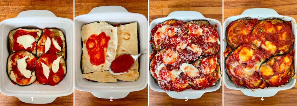 Uma variante saborosa da clássica parmegiana, com adição de pão carasau entre as camadas de berinjela, tomate e mussarela… o pão absorve o líquido em excesso e ganha sabor com o molho de tomate, tornando também mais fácil cortar as porções. Nesta receita, assei as fatias de berinjela no forno, para que fiquem macias e saborosas, mas mais leves em comparação à fritura. Você pode, no entanto, cozinhar as berinjelas da maneira que preferir, na frigideira com bastante óleo ou na grelha. Experimente a parmegiana de berinjela com pão carasau, é realmente muito simples!