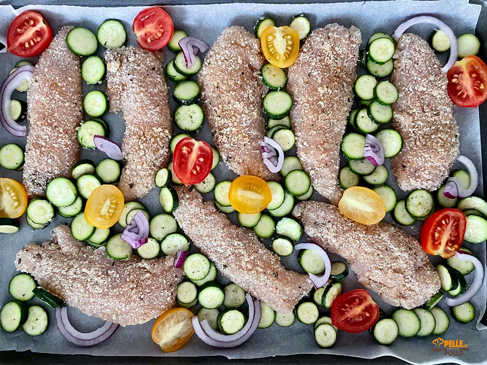 Um prato principal muito fácil e leve, ótimo para servir no jantar durante a temporada de verão, e não só. O peito de frango com abobrinha e tomatinhos é preparado em poucos minutos e assado no forno, tudo em uma única assadeira. A carne é simplesmente untada com óleo e passada na farinha de rosca, sem usar ovos, enquanto os vegetais são adicionados diretamente crus. Experimente esta receita porque é realmente rápida e deliciosa!