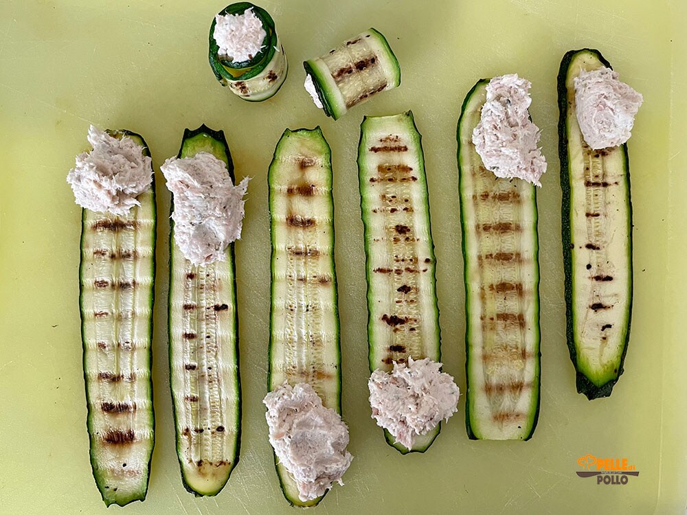 • Distribua o recheio sobre as abobrinhas grelhadas e enrole-as de modo a formar rolinhos.