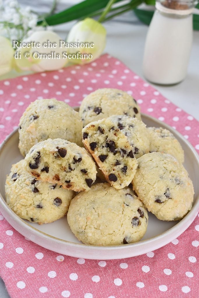 Biscoitos de coco e chocolate, biscoitos rápidos de fazer em 5 minutos, macios e que derretem na boca, sem manteiga, preparados com coco desidratado e óleo de coco, que os tornam realmente especiais, e enriquecidos com muitas gotas de chocolate amargo que os tornam biscoitos especiais. Os biscoitos de coco e chocolate são realmente um mimo delicioso, daqueles que te deixam feliz na primeira mordida e depois do primeiro é impossível resistir, são uma verdadeira tentação, um após o outro desaparecem como um prazer. Talvez você os lembre na versão simples, meus biscoitos de coco, deliciosos mesmo sem chocolate, mas depois de provar os biscoitos com gotas de chocolate, quis tentar a combinação de coco e chocolate, que é uma delícia exagerada. Aqui estão outros biscoitos deliciosos para fazer em casa.