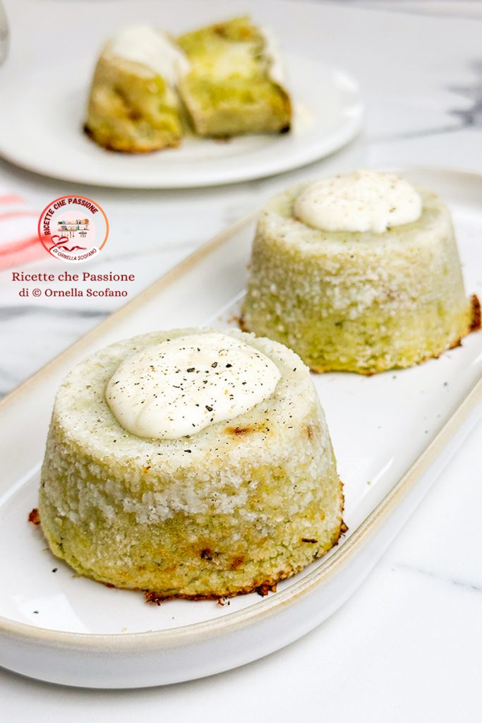 Retiramos os bolinhos do forno, viramos em um prato de servir ainda quentes, assim que os retiramos do forno, despejamos um pouco de fonduta por cima e neste ponto estamos prontos para saborear uma verdadeira delícia, os bolinhos de batata e brócolis com coração derretido e delicioso creme de parmesão.