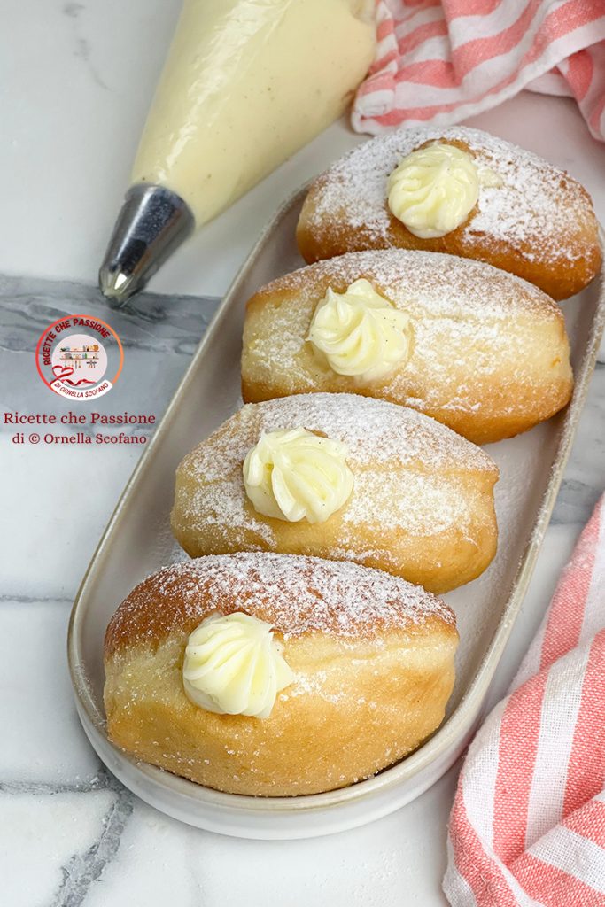 Retomamos o creme, trabalhamos com um batedor, elétrico ou à mão, e colocamos em um saco de confeitar. furamos os bomboloni de um lado com um bico e recheamos com o saco de confeitar. polvilhamos com açúcar de confeiteiro e desfrutamos dessas delícias. O ideal é consumi-los no mesmo dia, se quiser deixar para o dia seguinte recomendo fechar bem, aquecê-los levemente, no micro-ondas por 30 segundos, ou no forno, e recheá-los apenas quando necessário, assim estarão como recém-feitos. Para ter brioches fofos é necessário trabalhar bem a massa e deixá-la fermentar bem.