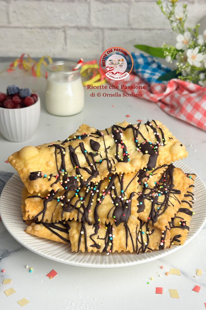 • Derretemos 200 g de chocolate amargo em banho-maria ou em uma tigela no micro-ondas, aquecendo alguns segundos de cada vez. Colocamos as chiacchiere em uma bandeja uma vez frias e cobrimos com chocolate derretido. Lembre-se de que com estas medidas, você terá pelo menos 4 bandejas grandes. Polvilhamos com confeitos coloridos enquanto o chocolate ainda está mole, e deixamos esfriar sem empilhar.