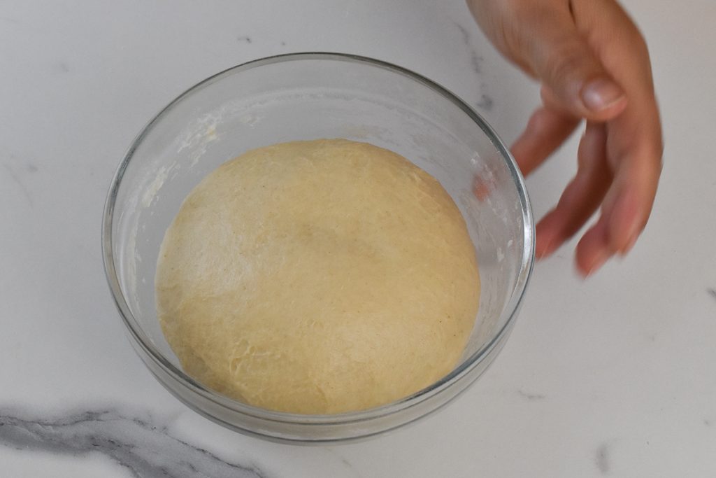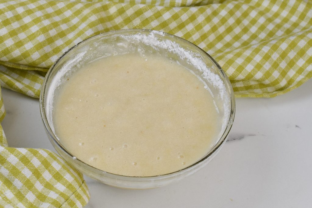 Começamos a preparar o pré-fermento. Em uma tigela, dissolvemos o fermento no leite morno. Mexemos com uma colher e adicionamos a farinha, misturamos bem até obter uma massa macia e pegajosa. Trabalhamos bem de modo que fique sem grumos e elástica, em um par de minutos estará pronto. Cobrimos e deixamos fermentar. Deixamos crescer até dobrar de volume, ou até ver que na superfície começará a formar bolhas. O tempo varia conforme a temperatura ambiente, que pode variar de 28°C a 15°C; quanto mais alta a temperatura, menor o tempo, recomendo sempre um meio-termo.