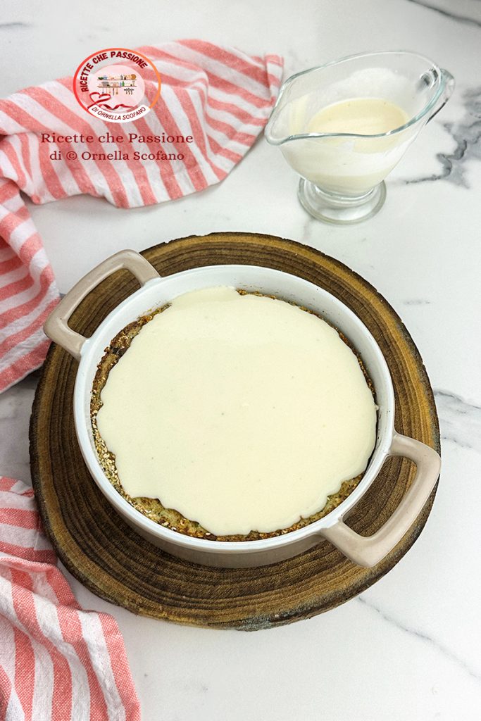 Polvilhamos manteiga e farinha de rosca em uma forma de 20 cm e colocamos todo o conteúdo na forma. Nivelamos com uma colher. Cozinhamos no forno por 20 minutos a 200°C ventilado ou na fritadeira a ar por 6 minutos a 180 graus.