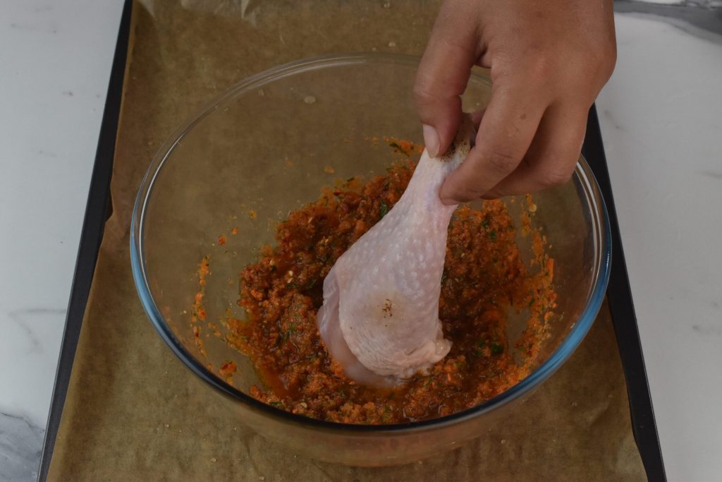 Forramos a assadeira do forno com papel manteiga molhado e espremido. Trabalhamos na assadeira, passando as coxas de frango, uma por uma, no creme que preparamos e, à medida que fazemos, as colocamos no papel manteiga, dando espaço entre elas. Deixamos cerca de metade do creme para temperar as batatas.