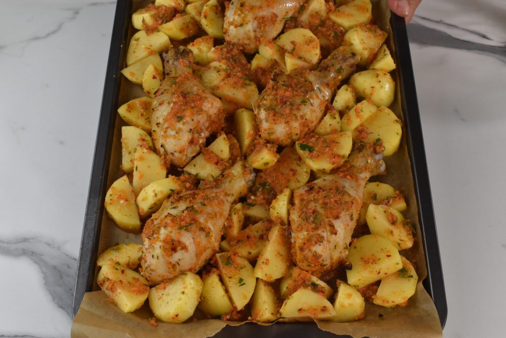 Retiramos o frango do forno após 10-15 minutos, adicionamos as batatas nos espaços vazios, sem sobrepô-las. Voltamos ao forno por mais 45 minutos, ainda a 200ºC. Aumentamos para 220 nos últimos 10 minutos. Se necessário, mexemos na metade do tempo de cozimento, eu dei uma virada apenas no frango cerca de metade do cozimento, na fase final.