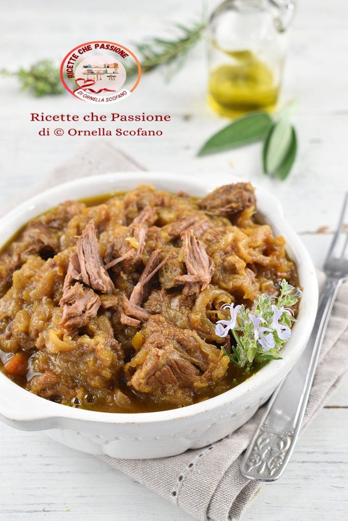 Tampe e leve ao cozimento, acrescentando um pouco de sal. Deixe a carne cozinhar com o líquido que as cebolas vão liberando. O cozimento dura cerca de 5 a 7 horas. Se, na metade do cozimento, houver pouco líquido na panela, acrescente um pouco de vinho branco e continue a cozinhar até que a carne esteja bem macia e se desfaça, e as cebolas tenham virado um creme. No final, o vinho deve estar completamente evaporado, por isso a parte final do cozimento em fogo mais alto deve ser feita sem tampa. Ajuste no final com sal e pimenta.