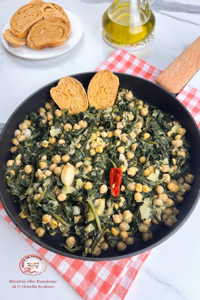 Querendo um prato único saudável, leve e saboroso, então prepare comigo o grão-de-bico com chicória na frigideira. Um prato com sabor intenso e simplesmente delicioso. Desta vez, em vez de usar a chicória do balcão, quis experimentar a de saquinho, sempre fresca, a cozinhei diretamente na frigideira, e devo admitir que, embora muito macia, era bem mais amarga do que a chicória macia que costumo comprar no balcão. Portanto, se não gosta muito de amargo, aconselho ferver antes, com uma batata, ou comprar chicória fresca e macia do balcão. Já fiz várias vezes crua e fica ótima. Eu, como vocês sabem, quanto mais amarga, mais gosto. Então, realmente aproveitei, depois o grão-de-bico sendo mais doce quebra o amargo e, além disso, adicionei uma batata durante o cozimento, pois percebi que estava muito amarga. No final, para mim, estava deliciosa, mas entendo que talvez alguém não goste de algo muito amargo.