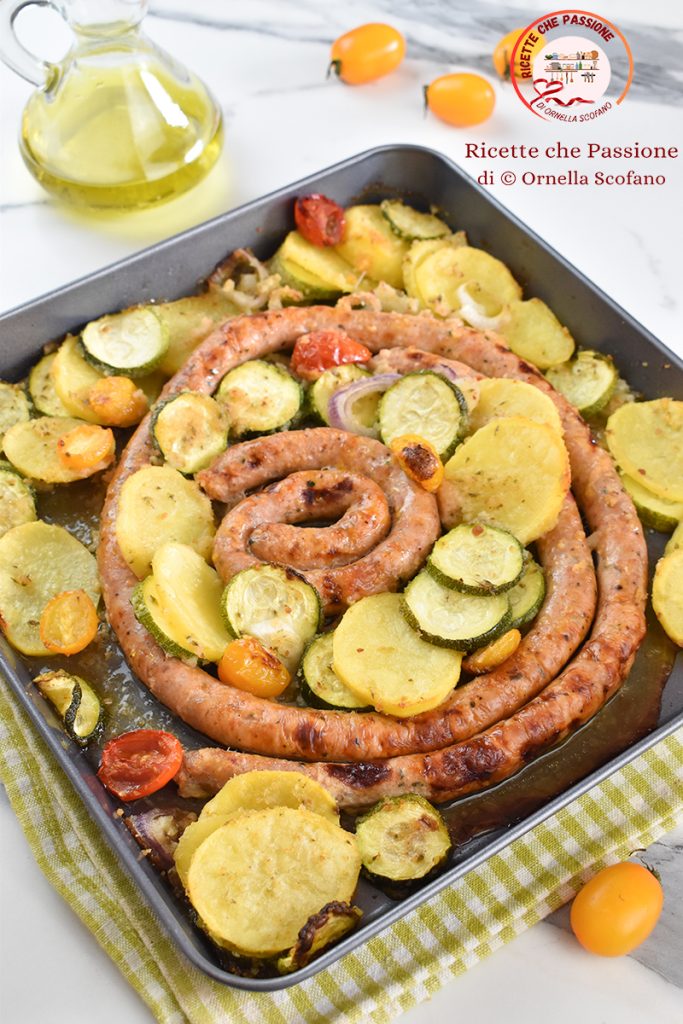 Linguiçinhas assadas com legumes saborosos, uma receita muito fácil para preparar de última hora almoço ou jantar, perfeita em qualquer ocasião, ótimo como prato único para 2 pessoas, ou 4 dobrando a quantidade dos legumes. Comprei algumas linguiçinhas aromatizadas com ervas, me chamaram a atenção porque foram descritas como aromatizadas com ervas e assim não as deixei escapar, para realçar o sabor pensei em cozinhá-las com um pouco de legumes, eu tinha apenas uma abobrinha então adicionei 2 batatas, devo dizer que a escolha foi acertada, resultou em um belo prato completo, e os legumes ficaram deliciosos, graças aos sucos liberados pela linguiça.