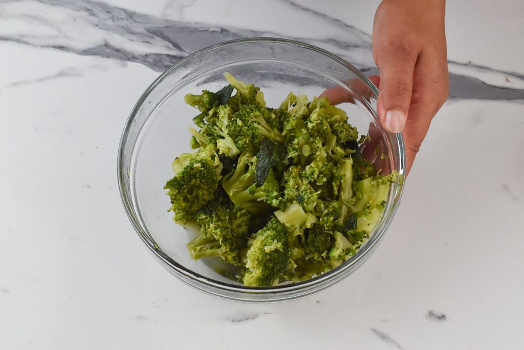 3. Cozinhamos os brócolis em água fervente e pouco salgada. Escorremos sem descartar a água do cozimento e reservamos. Usamos uma escumadeira para retirar rapidamente os brócolis da água fervente.