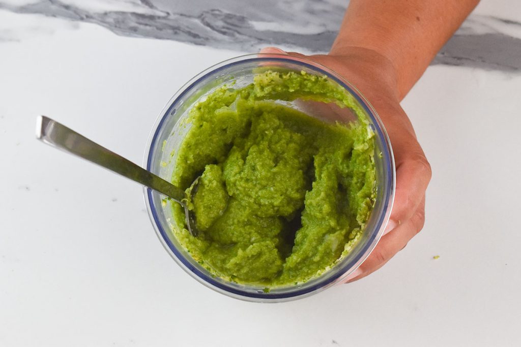 5. Preparamos o creme de brócolis. Colocamos no copo do liquidificador ou processador, com uma xícara ou 2 de água do cozimento e batemos, podemos usar um liquidificador ou um processador, em poucos segundos obteremos um creme de brócolis.
