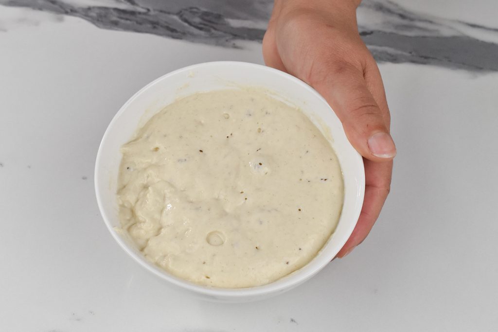 Em uma tigelinha, colocamos o fermento com a água e o leite, e o dissolvemos, depois adicionamos a farinha, misturamos até obter um creme, e deixamos fermentar. O tempo de fermentação varia conforme a temperatura, leva de 2-3 horas para fermentar a cerca de 26-28°C a 12 horas a 12-14°C.