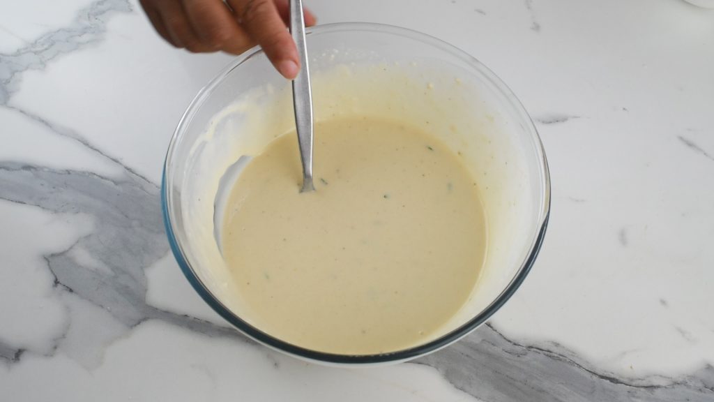 Em uma tigela, colocamos o ovo com a farinha, o fermento, o parmesão, sal, menta picada e então adicionamos aos poucos o leite, mexendo com uma colher, de modo a obter uma massa sem grumos.